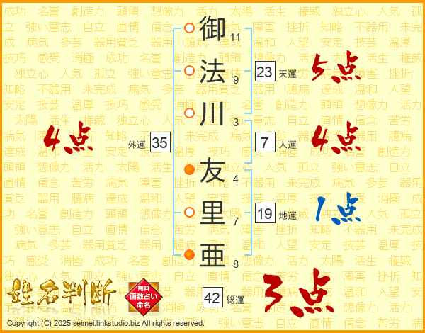御(11画)法(9画)川(3画) 友(4画)里(7画)亜(8画)