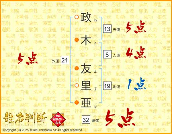 政(9画)木(4画) 友(4画)里(7画)亜(8画)