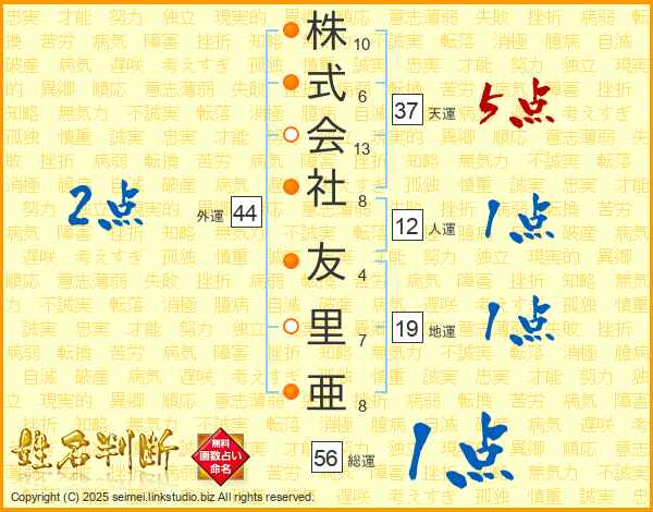 株(10画)式(6画)会(13画)社(8画) 友(4画)里(7画)亜(8画)
