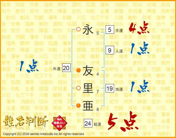 生活面を象徴する運勢です。外部から受ける影響力を表し、結婚運、家庭運や職場、環境への順応性を表します。総運から人運を引いた画数。姓や名が1文字の場合を除く。