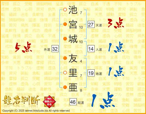 池(7画)宮(10画)城(10画) 友(4画)里(7画)亜(8画)