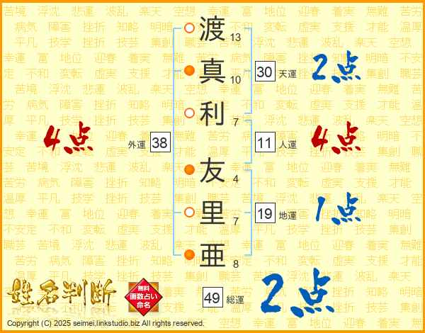渡(13画)真(10画)利(7画) 友(4画)里(7画)亜(8画)