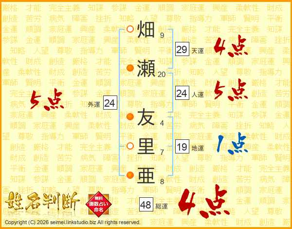 畑(9画)瀬(20画) 友(4画)里(7画)亜(8画)