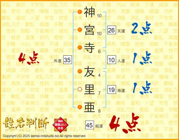 神(10画)宮(10画)寺(6画) 友(4画)里(7画)亜(8画)
