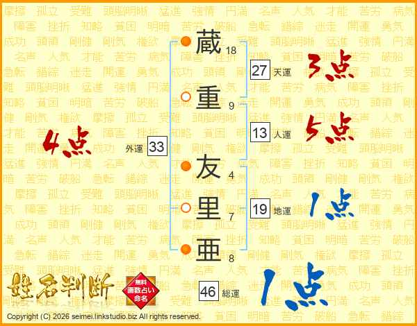 蔵(18画)重(9画) 友(4画)里(7画)亜(8画)