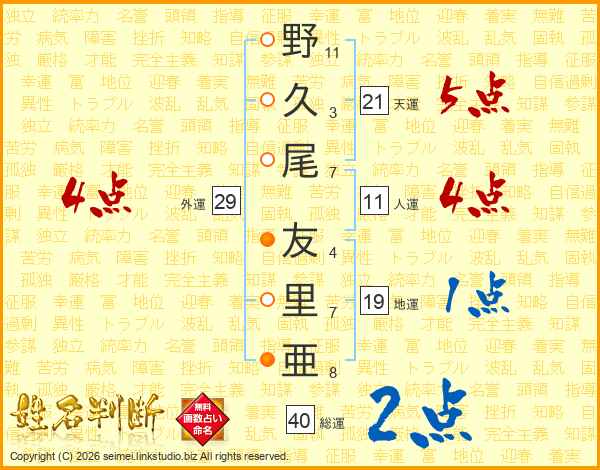 野(11画)久(3画)尾(7画) 友(4画)里(7画)亜(8画)