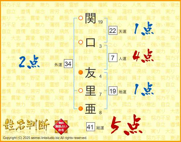 関(19画)口(3画) 友(4画)里(7画)亜(8画)