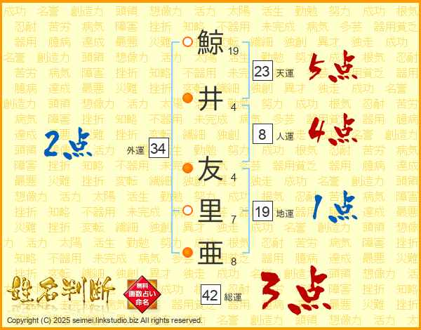 鯨(19画)井(4画) 友(4画)里(7画)亜(8画)