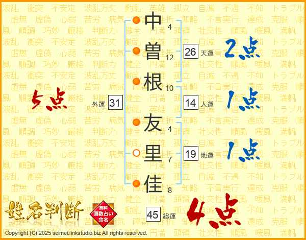 中(4画)曽(12画)根(10画) 友(4画)里(7画)佳(8画)