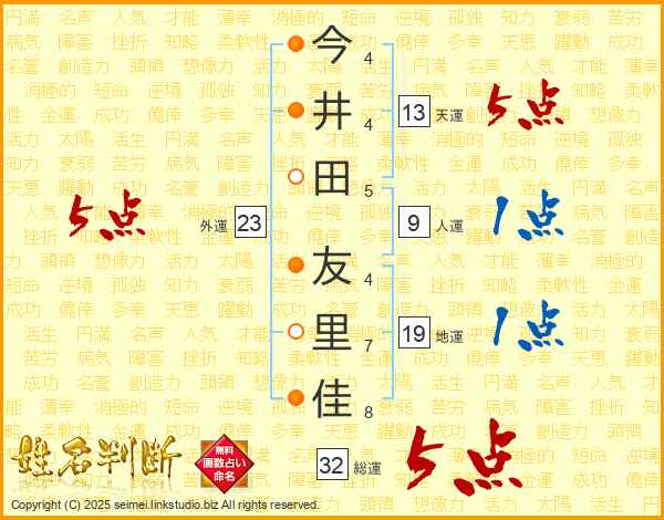 今(4画)井(4画)田(5画) 友(4画)里(7画)佳(8画)