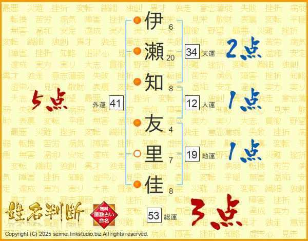 伊(6画)瀬(20画)知(8画) 友(4画)里(7画)佳(8画)