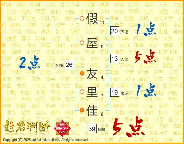 生活面を象徴する運勢です。外部から受ける影響力を表し、結婚運、家庭運や職場、環境への順応性を表します。総運から人運を引いた画数。姓や名が1文字の場合を除く。