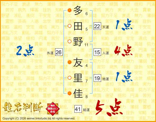 多(6画)田(5画)野(11画) 友(4画)里(7画)佳(8画)