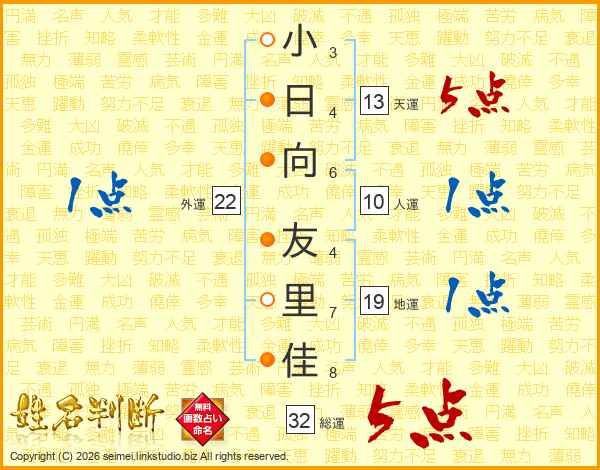 小(3画)日(4画)向(6画) 友(4画)里(7画)佳(8画)