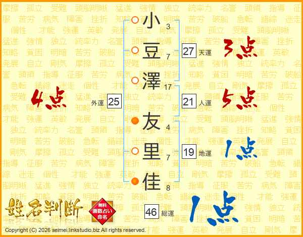 小(3画)豆(7画)澤(17画) 友(4画)里(7画)佳(8画)