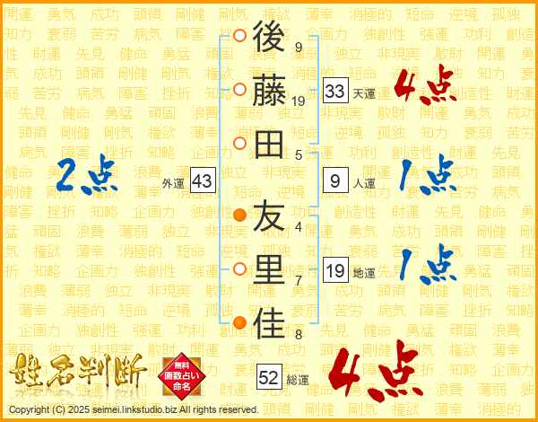 後(9画)藤(19画)田(5画) 友(4画)里(7画)佳(8画)