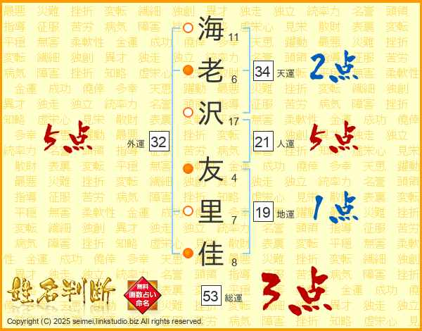 海(11画)老(6画)沢(17画) 友(4画)里(7画)佳(8画)