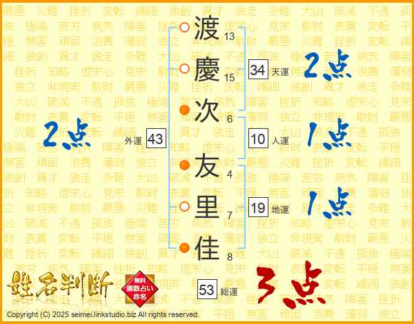 渡(13画)慶(15画)次(6画) 友(4画)里(7画)佳(8画)