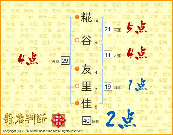 糀(14画)谷(7画) 友(4画)里(7画)佳(8画)