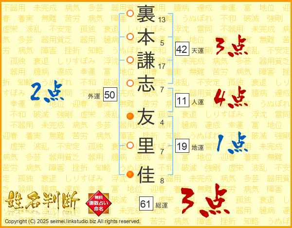 裏(13画)本(5画)謙(17画)志(7画) 友(4画)里(7画)佳(8画)
