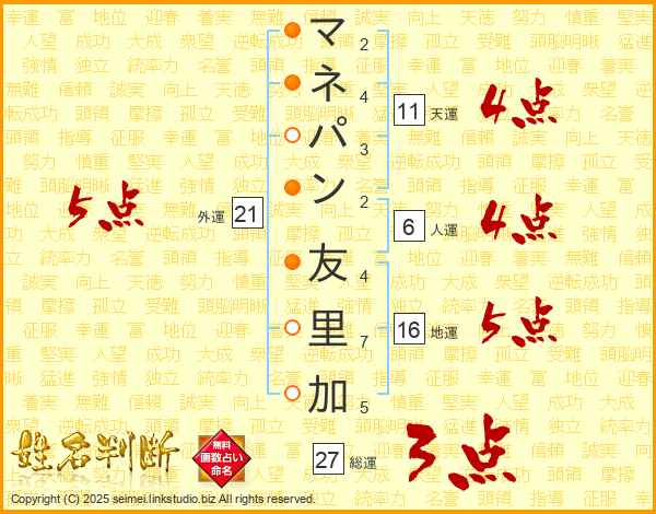 マ(2画)ネ(4画)パ(3画)ン(2画) 友(4画)里(7画)加(5画)