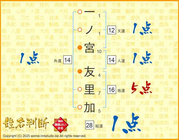 一(1画)ノ(1画)宮(10画) 友(4画)里(7画)加(5画)
