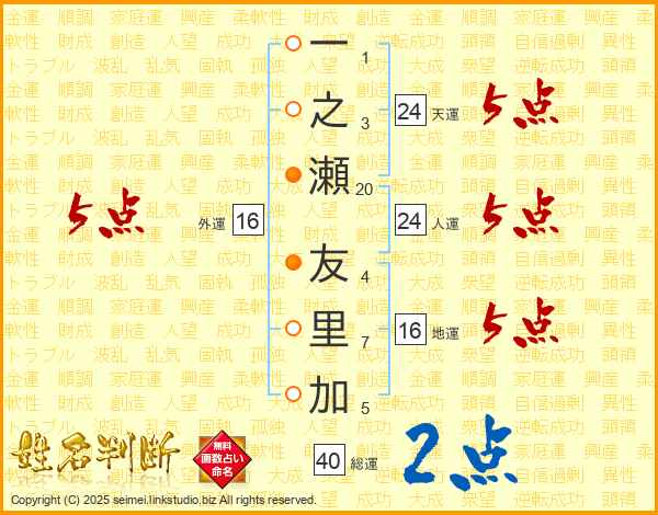 一(1画)之(3画)瀬(20画) 友(4画)里(7画)加(5画)
