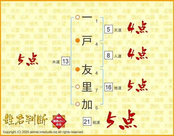 一(1画)戸(4画) 友(4画)里(7画)加(5画)
