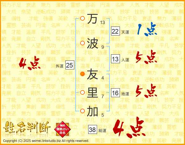 万(13画)波(9画) 友(4画)里(7画)加(5画)