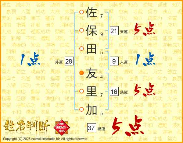 佐(7画)保(9画)田(5画) 友(4画)里(7画)加(5画)