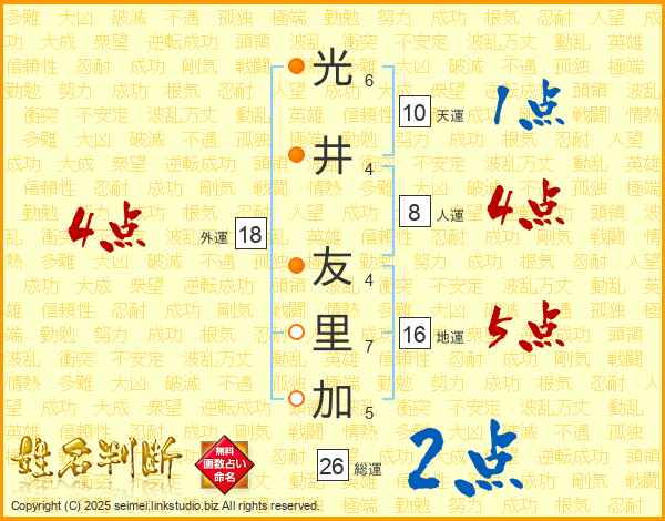 光(6画)井(4画) 友(4画)里(7画)加(5画)