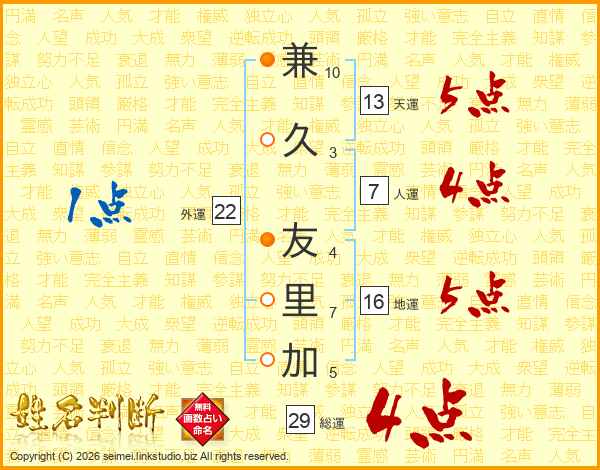 兼(10画)久(3画) 友(4画)里(7画)加(5画)