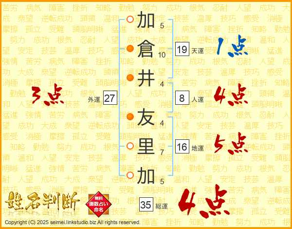 加(5画)倉(10画)井(4画) 友(4画)里(7画)加(5画)