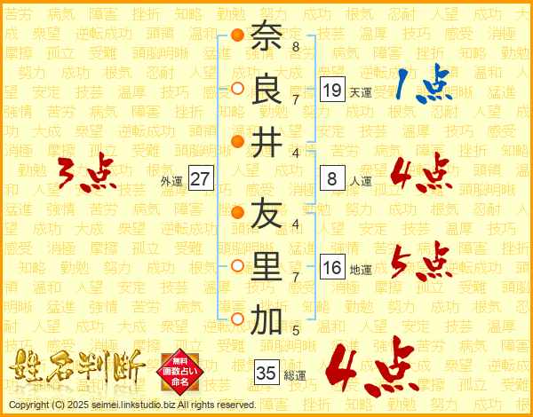 奈(8画)良(7画)井(4画) 友(4画)里(7画)加(5画)