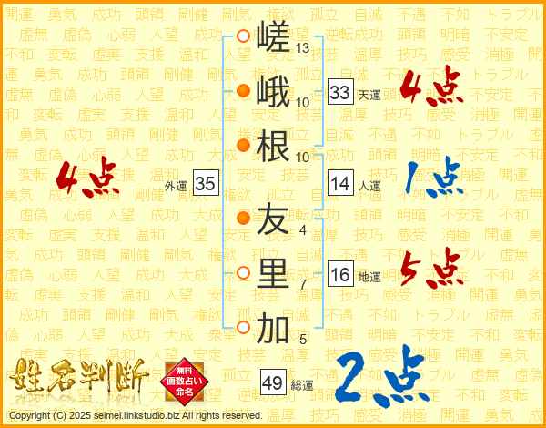 嵯(13画)峨(10画)根(10画) 友(4画)里(7画)加(5画)