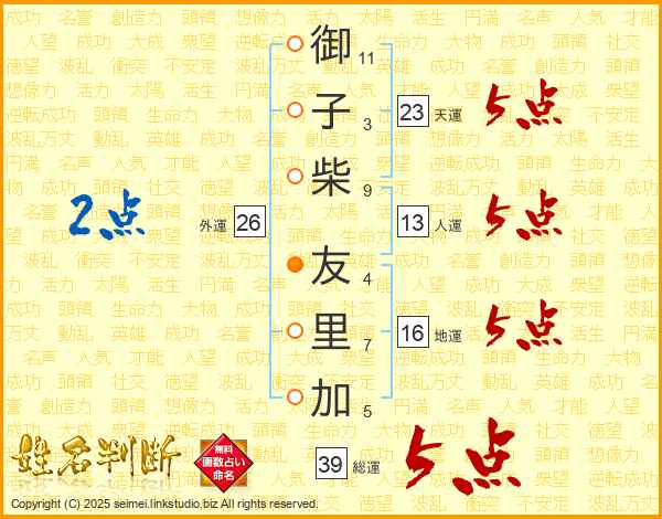 御(11画)子(3画)柴(9画) 友(4画)里(7画)加(5画)