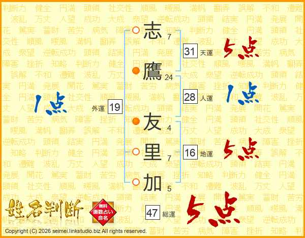 志(7画)鷹(24画) 友(4画)里(7画)加(5画)
