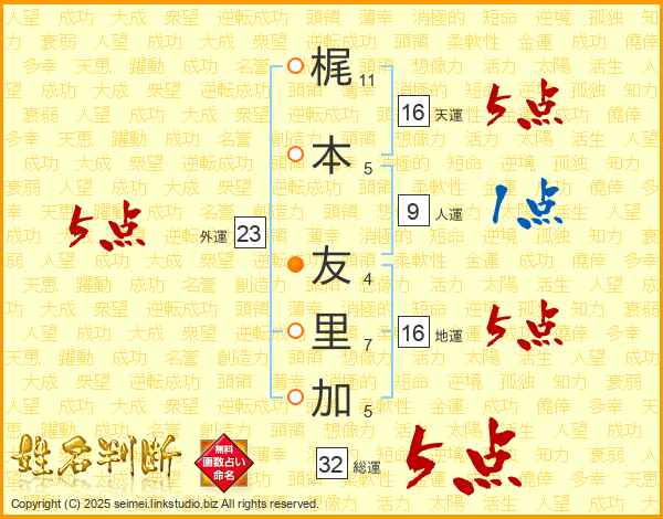 梶(11画)本(5画) 友(4画)里(7画)加(5画)