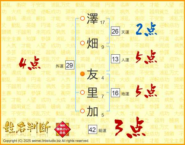 澤(17画)畑(9画) 友(4画)里(7画)加(5画)