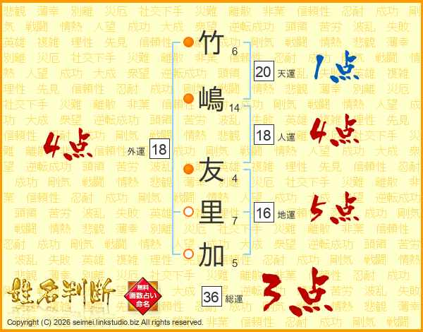 竹(6画)嶋(14画) 友(4画)里(7画)加(5画)