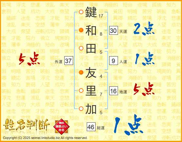 鍵(17画)和(8画)田(5画) 友(4画)里(7画)加(5画)