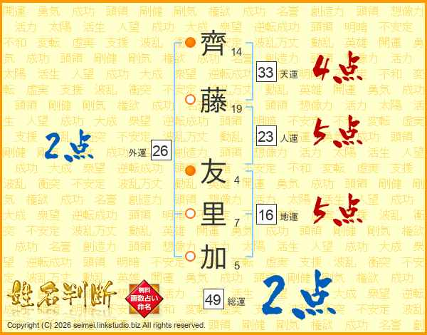 齊藤友里加さんの天運は33画の4点!