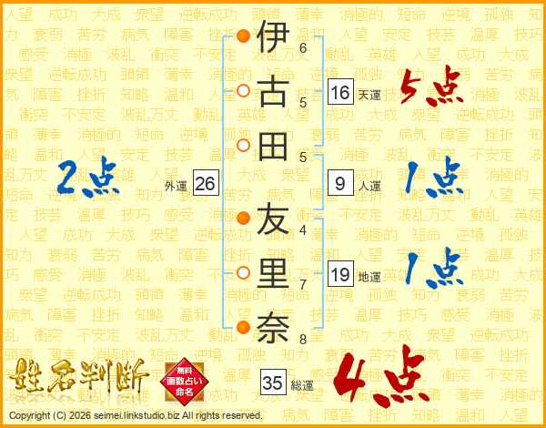 伊(6画)古(5画)田(5画) 友(4画)里(7画)奈(8画)