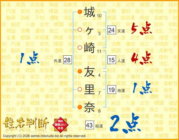 城(10画)ヶ(3画)崎(11画) 友(4画)里(7画)奈(8画)