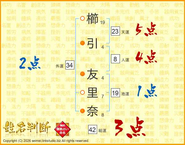 櫛(19画)引(4画) 友(4画)里(7画)奈(8画)