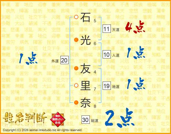 石(5画)光(6画) 友(4画)里(7画)奈(8画)