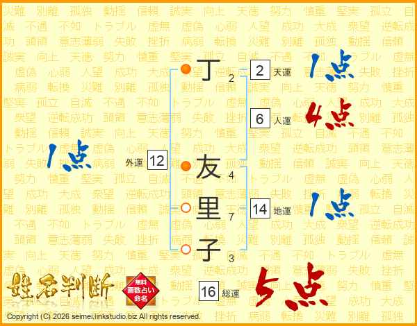 丁(2画) 友(4画)里(7画)子(3画)