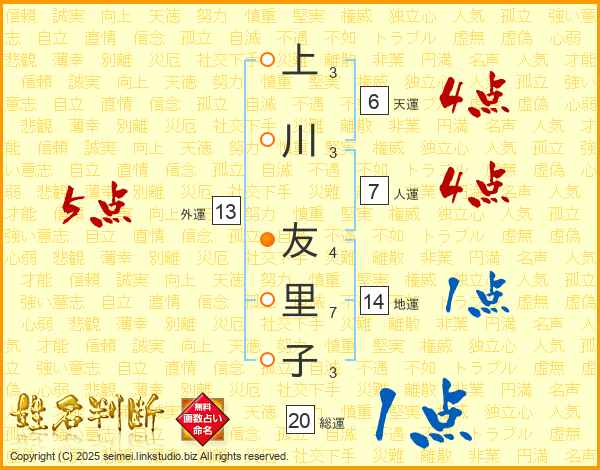 生活面を象徴する運勢です。外部から受ける影響力を表し、結婚運、家庭運や職場、環境への順応性を表します。総運から人運を引いた画数。姓や名が1文字の場合を除く。