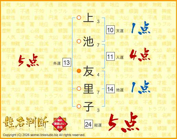 上(3画)池(7画) 友(4画)里(7画)子(3画)