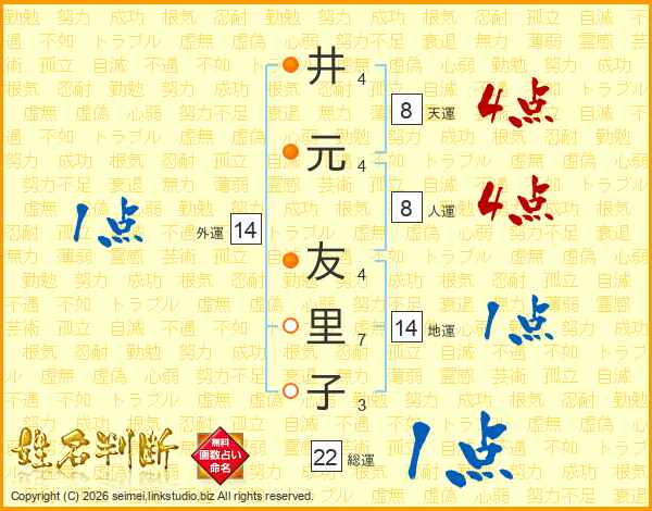 井(4画)元(4画) 友(4画)里(7画)子(3画)